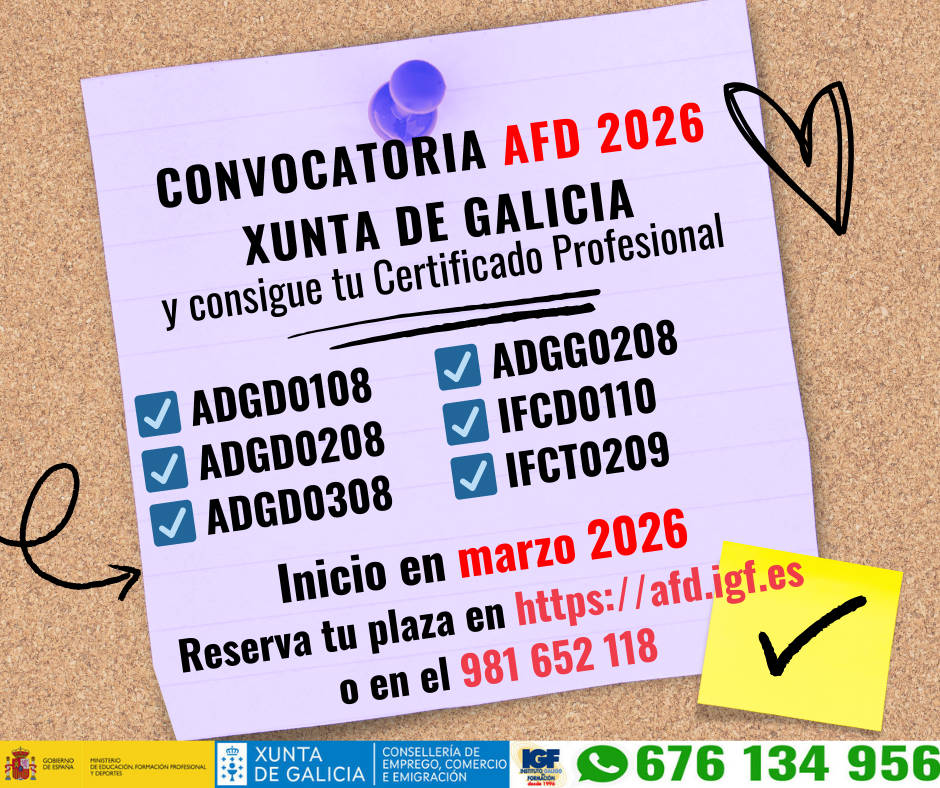 Cursos AFD 2026 da Xunta de Galicia, GRATIS para desempleados y trabajadores en activo de Galicia, al estar financiados pola Consellería de Emprego, Comercio e Emigración da Xunta de Galicia e polo Ministerio de Educación, Formación Profesional e Deportes do Goberno de España.
